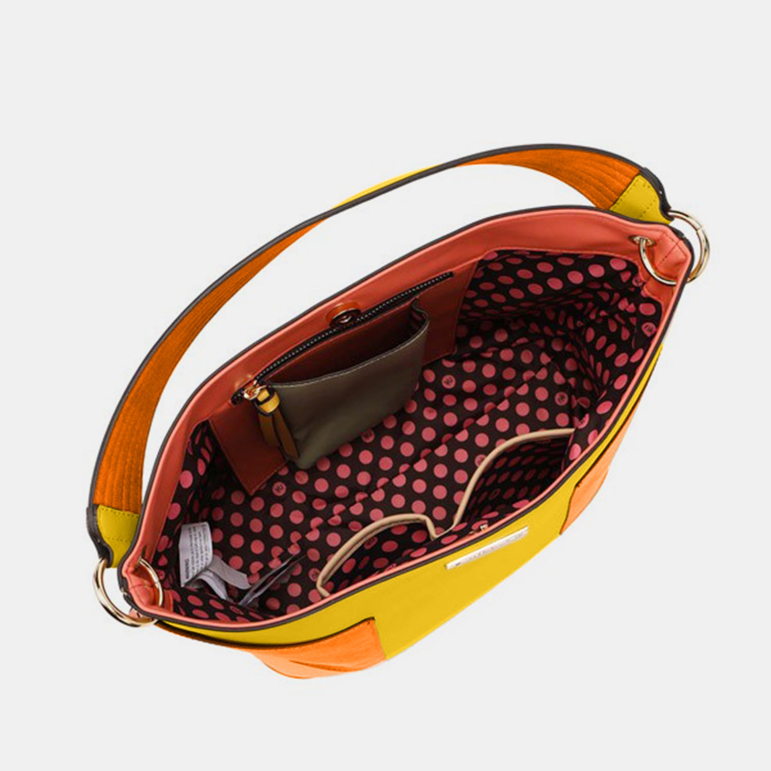 - Large interior lined with signature Nikky polka dot print polyester fabric.